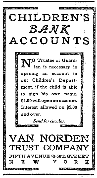This is an advertisement from the Van Norden Trust Company, the furthest uptown of the uptown trust companies. It illustrates how much their strategy differed from the focus of traditional trust companies on business clients.